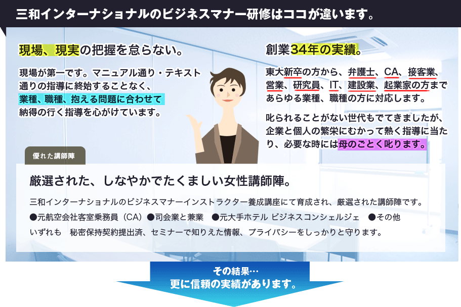 実践型でわかりやすく。その成果か、三和インターナショナルのビジネスマナーセミナーは高いリピート率を誇ります。受講後の成果がきちんと仕事に反映されていることの証と自負しております。